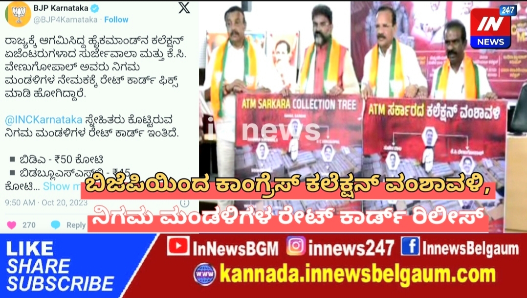 ಕಾಂಗ್ರೆಸ್ ಸರ್ಕಾರ ನಿಗಮ ಮಂಡಳಿಗಳಲ್ಲೂ ಕಮೀಷನ್ ವಸೂಲಿ ಮಾಡುತ್ತಿದೆ. ರಾಜ್ಯಕ್ಕೆ ಆಗಮಿಸಿದ್ದ ಹೈಕಮಾಂಡ್ನ ಕಲೆಕ್ಷನ್ ಏಜೆಂಟರುಗಳಾದ ಸುರ್ಜೇವಾಲಾ ಮತ್ತು ಕೆ.ಸಿ. ವೇಣುಗೋಪಾಲ್ ಅವರು ನಿಗಮ ಮಂಡಳಿಗಳ ನೇಮಕಕ್ಕೆ ರೇಟ್ ಕಾರ್ಡ್ ಫಿಕ್ಸ್ ಮಾಡಿ ಹೋಗಿದ್ದಾರೆ. ಕಾಂಗ್ರೆಸ್ ಸ್ನೇಹಿತರು ಕೊಟ್ಟಿರುವ ನಿಗಮ ಮಂಡಳಿಗಳ ರೇಟ್ ಕಾರ್ಡ್ನ್ನು ಬಿಡುಗಡೆ ಮಾಡಿದ್ದೇವೆ ಎಂದು ಒಂದು ಪಟ್ಟಿಯನ್ನು ಬಿಜೆಪಿ ಬಿಡುಗಡೆ ಮಾಡಿದೆ.